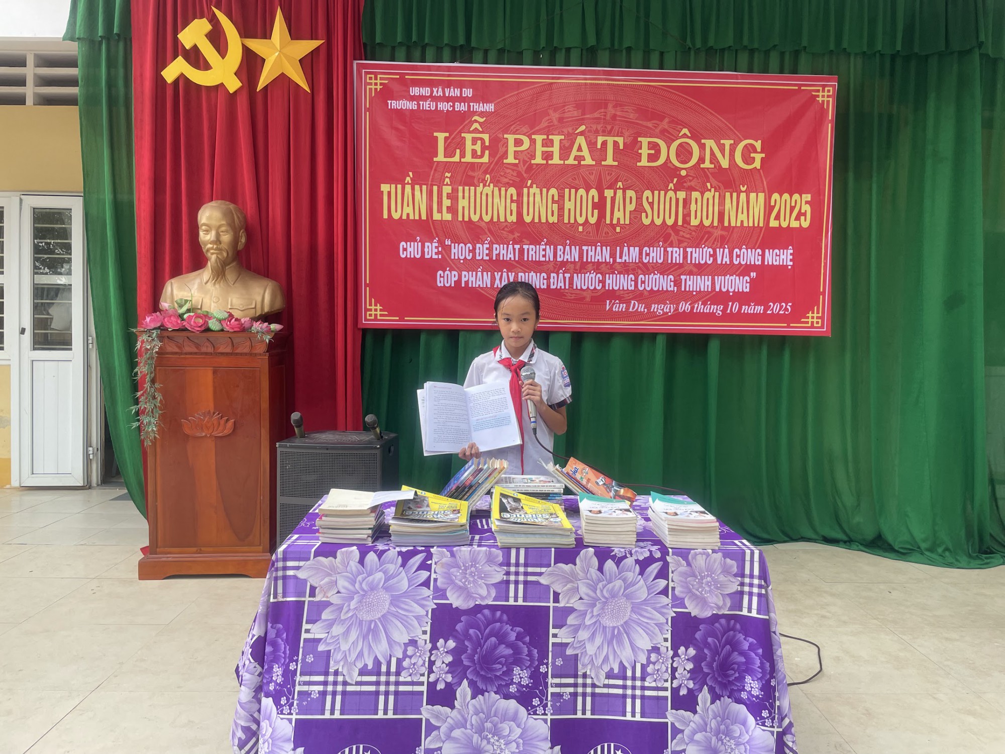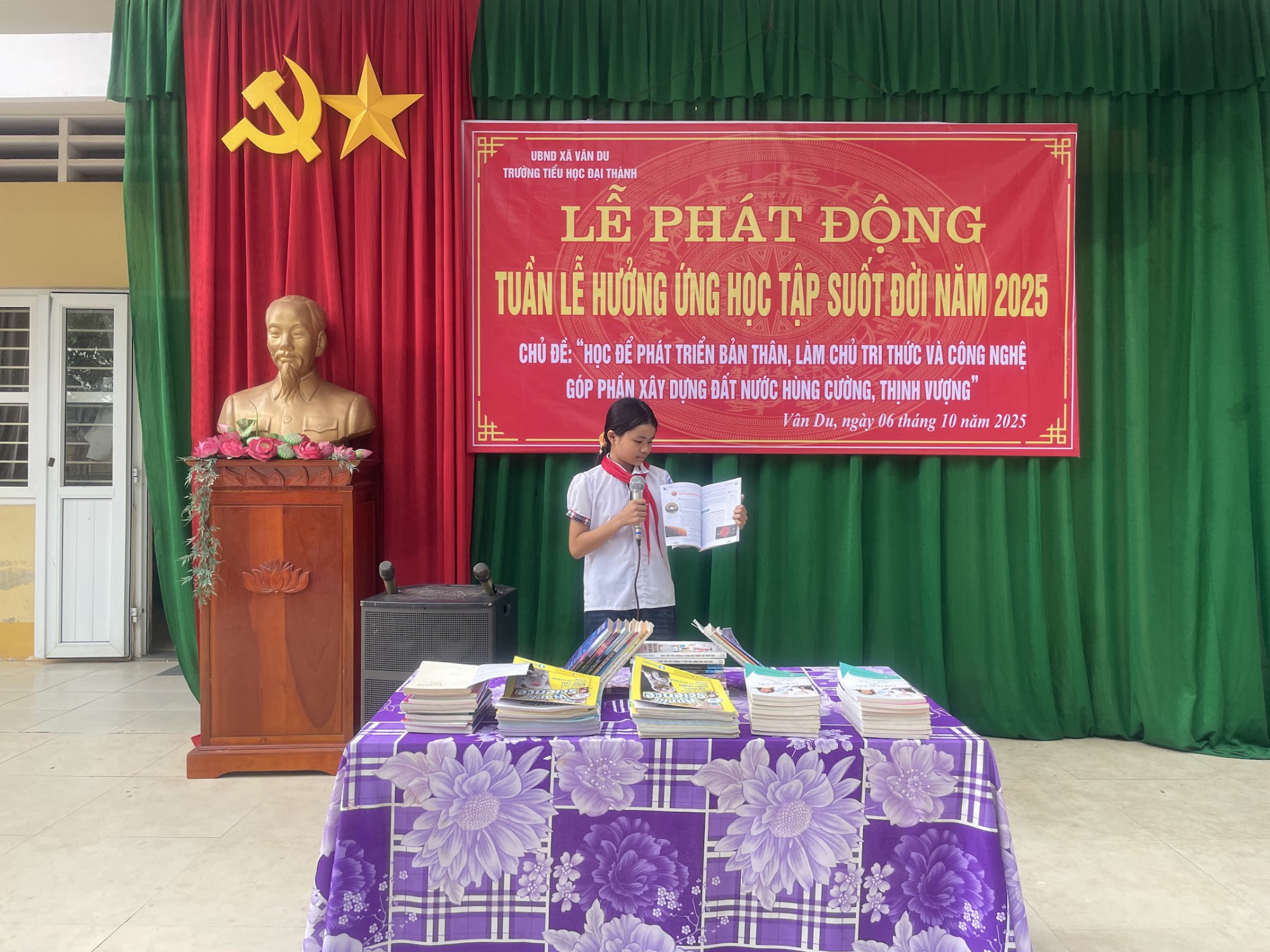 Sáng nay, tại Trường Tiểu học Đại Thành (xã Vân Du, tỉnh Nghệ An), thầy và trò nhà trường đã long trọng tổ chức lễ phát động Tuần lễ hưởng ứng học tập suốt đời năm 2025 với chủ đề: “Học để phát triển bản thân, làm chủ tri thức và công nghệ, góp phần xây dựng đất nước hùng cường, thịnh vượng”.